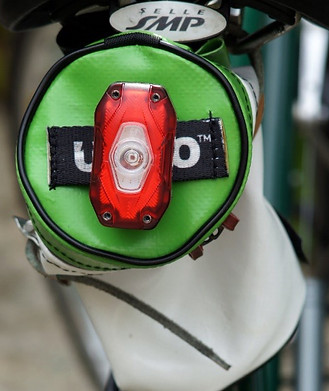 The bag attaches to the Brompton frame via two beefy Velcro straps, two Velcro flaps and a sleeve. Then there’s a similarly stout, detachable shoulder strap for lugging it around sans bike. A big scuff bumper at the bottom protects the fabric from premature wear and the main compartment features a rigid base, which retains stiffness and shape. A front-light loop on the flap, with reflective UPSO logo, will take a suitable blinkie. Our version also had some reflective sections of the carefully cut lorry tarp in a line along the flap.